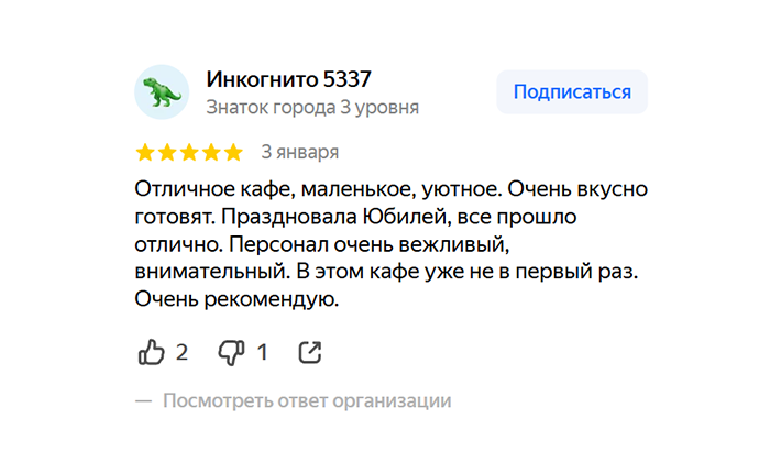 Отличное кафе, маленькое, уютное. Очень вкусно готовят. Праздновала Юбилей, все прошло отлично. Персонал очень вежливый, внимательный. В этом кафе уже не в первый раз. Очень рекомендую.